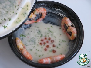Креветки помещаем в сливки и нагреваем до горячего состояния, но не допускаем кипения сливок. Мы это делаем для того, чтобы креветки отдали аромат сливочному бульону. Отдельно растворяем желатин в небольшом количестве горячих сливок и вводим в креветочный бульон. Добавляем шафран и соль по вкусу.
