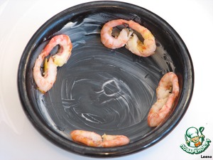 Формочку обмазываем сливочным маслом. Часть креветок прикрепляем к бортикам.