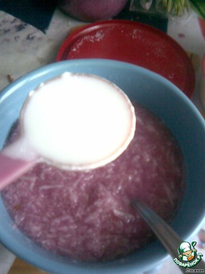 У меня в соус пошел готовый домашний хрен со свекольным соком. Но нужен просто тертый хрен, так как этот соус должен быть белым.