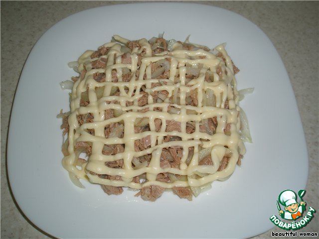Мясо с луком выкладываем на блюдо первым слоем. Рисуем сетку из майонеза.