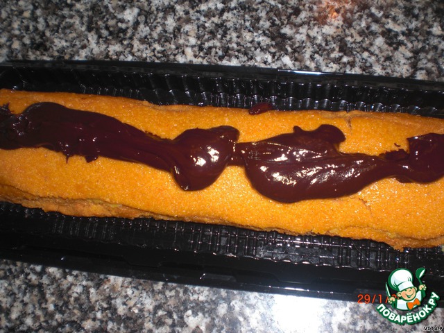 Корж вынуть из духовки, дать немного остыть. Посыпать сверху сахаром и сразу перекинуть на полотенце. Смазать кремом и скатать рулет. Для украшения растопить в шоколад с небольшим количеством сливок или воды, залить сверху, можно брать совсем небольшое количество.