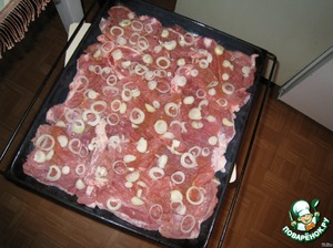 Свинину порезать на тонкие (где-то 1 см в толщину) продолговатые ломтики, как на отбивные, и отбить с двух сторон, выложить на противень, далее нарезать лук кольцами и выложить поверх мяса.