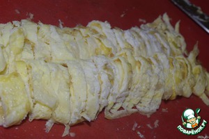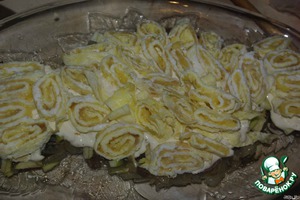 Яичные рулетики, нарезаем поперёк, толщиной 0,5 см.