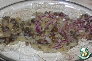 На блюдо, первым слоем, выкладываем остывшие грибы с луком. Посыпаем замаринованным луком.
