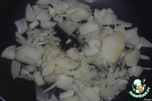 На растительном масле, обжариваем репчатый лук, нарезанный соломкой.