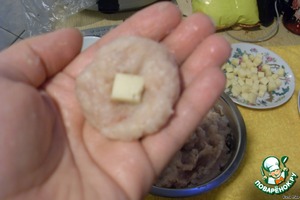 Из фарша формируем шарики размером с мячик для настольного тенниса. Внутрь кладем кубик сыра.