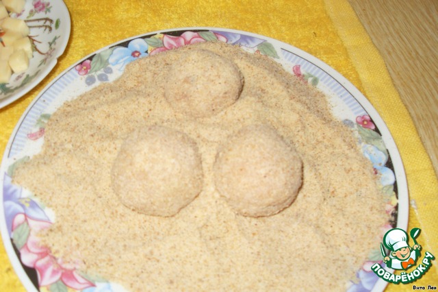 Обваливаем шарики в панировочных сухарях. Жарим шарики во фритюре. Если нет фритюрницы (как у меня), в сотейник наливаем растительное масло (у меня 1.5 стакана) хорошо разогреваем масло и на малом огне жарим шарики примерно 3-4 минуты, не больше. Они должны быть полностью покрыты маслом.