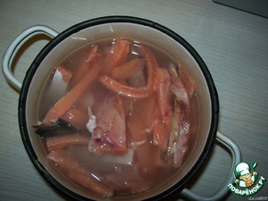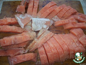 Для начала с сильно замороженной горбуши сдираем шкуру, затем ждем, когда рыба разморозится и отрезам голову и хвост, разрезаем вдоль хребта, вынимаем кости и режем примерно так!