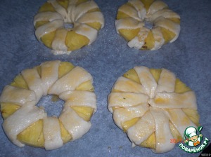 • Если честно, ромашками они случайно стали, теста маловато осталось, но так даже красивей. Каждый кусочек обматываем через середину тестом, можно обматывать очень плотно, чтобы фрукт не выглядывал, у меня теста осталось немного поэтому пришлось экономить. Оставим на 15 минут пока духовка греется до 200 градусов. Смазать желтком, посыпать сахаром и отправить в духовку минут на 20-30.