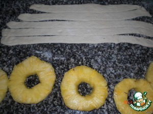 • Можно приготовить любое сдобное дрожжевое тесто, я взяла остатки, которые остались от приготовления пирожков (для теста дрожжи развести в молоке добавить остальные продукты, замесить тесто и оставить для поднятия на 1-2 часа). Тесто раскатываем, режем на тонкие полоски. Ананас очищаем и вынимаем сердцевину, режем на кольца.