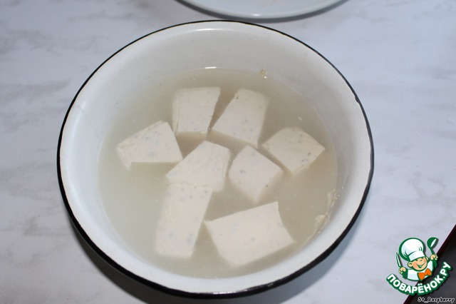 5. Берем сырки, кладем в миску, режем на небольшие кусочки и заливаем небольшим количеством горячей воды.