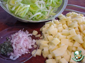Подготавливаем овощи: лук-порей нарезаем кольцами и тщательно моем, картофель чистим и нарезаем кубиками, лук-шалот – маленькими кусочками. У меня овощи мелко нарезаны по двум причинам: быстрее варятся и я люблю отложить часть готовых овощей и добавить их в уже готовый суп-пюре, чтобы в супе встречались и кусочки картофеля и лука. В принципе, можно довольно крупно нарезать.
