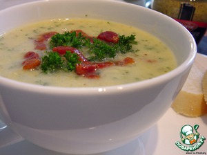 Уже в тарелочки добавляем жареный бекон и свежую веточку петрушки. Для вегетарианского варианта хорошо положить пару кусочков бри или камамбера, конечно, при условии, что пользовались овощным бульоном.