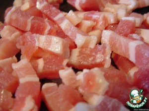 В это время нарезаем бекон кубиками и поджариваем до румяного цвета. Я люблю, когда он хрустящим становится, но это дело вкуса.