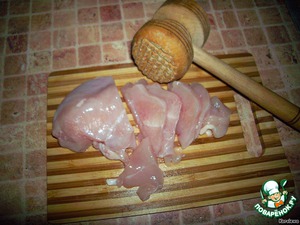 Грудку нарезаем поперёк волокон и слегка отбиваем.