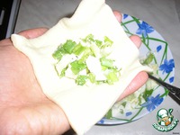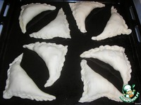 Раскатываем тесто и режем на квадратики. Кладём лук с яйцом и сворачиваем треугольничками.