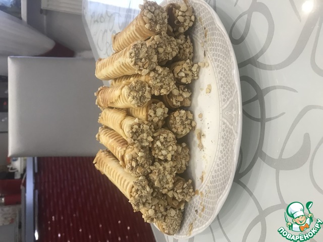 • Растопить масло, добавить сахар, размешать, добавить яйца, горячую воду, маленькими порциями добавлять муку. Замесить однородное тесто, если получилось густое, добавить немного воды. Выпекать в вафельнице, ещё горячими скрутить трубочки. Готовые трубочки начинить варёной сгущёнкой и обсыпать края поджаренными и дроблёнными орехами. Что может быть вкусней, как не трубочки из детства.