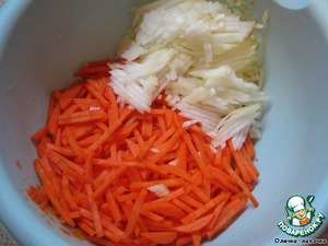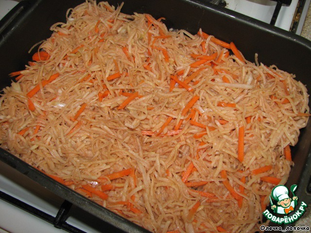 В картофель выложить морковь, лук, посолить. Можно добавить пару сырых яиц, но у меня в данный момент, как назло, их не оказалось (катастрофа!). Тщательно перемешать.