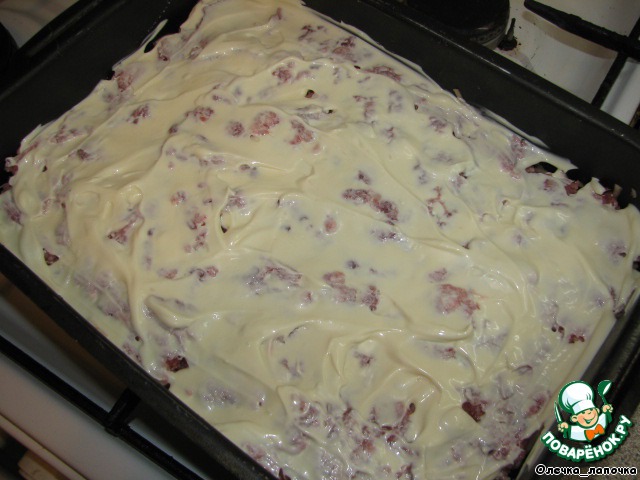 Поверх картофеля выложить слой из половины фарша. Смазать майонезом.