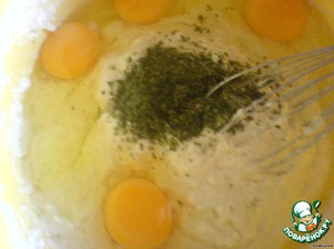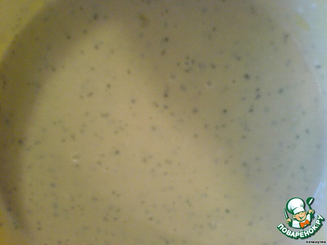 В муку наливаем воду, перемешали, добавили соль, перец, специи, зелень.