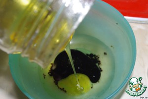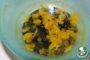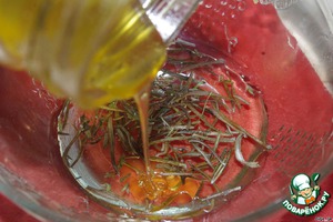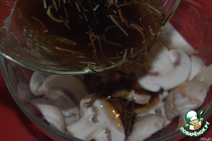 Приготовим маринад для шампиньонов. Для этого в оливковое масло (2 ст. ложки) добавим травки (немного), мёд (0,5 ч. ложки)... -