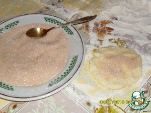 Шарики примять на столе, присыпанным мукой, и посыпать сахарной смесью.