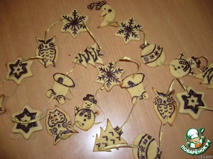 Делаем пряничную гирлянду. Взять золотистый шнурок длиной 2 м, скрепить им каждый пряник. Для этих целей я использовала обычную толстую швейную иглу. А лучше всего, еще до выпекания в каждом прянике сделать дырочки.