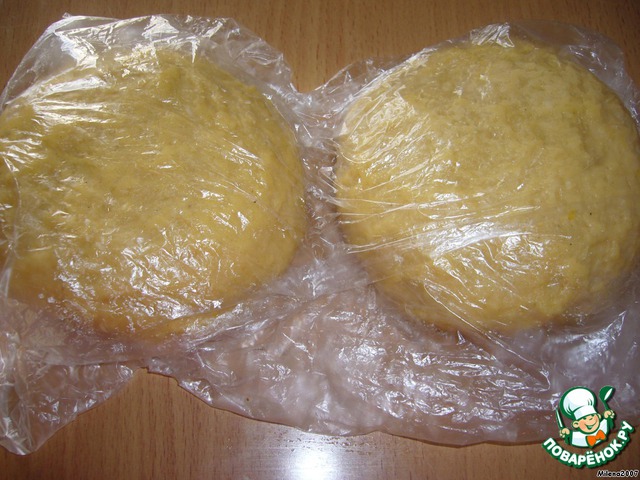 Разделить тесто на две части, обернуть плёнкой, убрать в холодильник примерно на 2 часа.