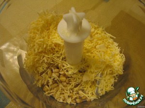 Чеснок чистим и режем на крупные кусочки, сыр трём на мелкой тёрке. Всё это добавляем к орешкам.