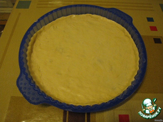 Готовое тесто раскатываем как можно тоньше, выкладываем в форму диаметром 25 см. Формируем бортики.
