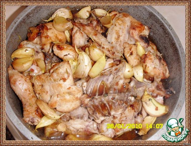 [quote]Это блюдо провансальской кухни готовится с 40 зубчиками чеснока, но за час пребывания в духовке чеснок теряет остроту и становится сладким. Чеснок для этого не чистится, что сокращает время приготовления и позволяет каждому самостоятельно решить, как обойтись с этим чесноком: то ли раздавить вилкой, смешать с мясным соком и полить курицу, то ли выложить поверх поджаренного хлеба, то ли просто отложить в сторону.[/quote]