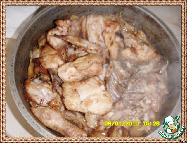 • Перелить содержимое сковороды в посуду, где уже лежит курица.