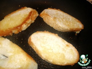 Ломтики багета обжарить на небольшом количестве оливкового масла до золотистой корочки.