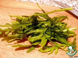 Рукколу промыть, мелко нарезать и добавить к мясу.