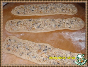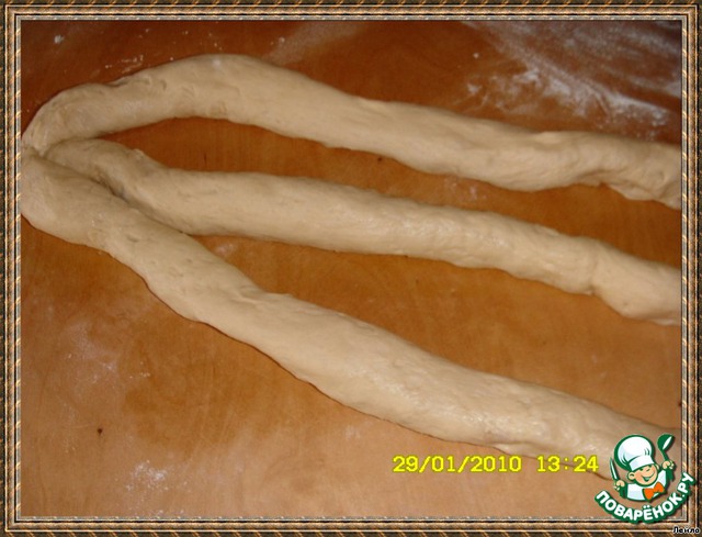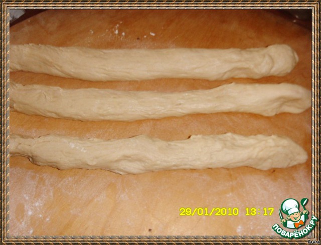 Когда тесто подошло, раскатываем каждый шарик в жгутик (по длине противня)