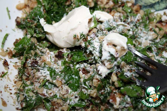 • Сделать начинку: измельчить орехи, укроп и петрушку. Добавить майонез и перемешать.