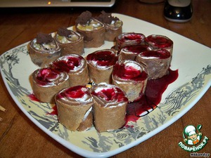 теперь блинчик мажем маскарпоне или творожной начинкой, кладем фрукты полосочками, заворачиваем плотно в рулетики.