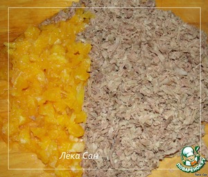 Для начинки отварную говядину измельчить, добавить нарезанный апельсин, влить образовавшийся от него сок, добавить немного майонеза, перемешать.