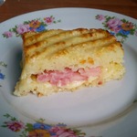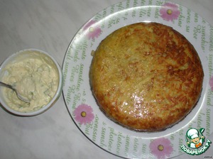 На большую плоскую тарелку переворачиваем нашу запеканку. Подаем с соусом. У меня это майонез с чесноком и зел.луком (в реале, это сметана с чесноком и солью) -