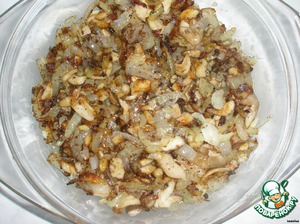 А теперь кладем нашу начинку (в реале в этом рецепте идет фарш, но как вы понимаете, начинка может быть абсолютно разная, что у кого есть под рукой), у меня вешенки, обжаренные с луком и специями.