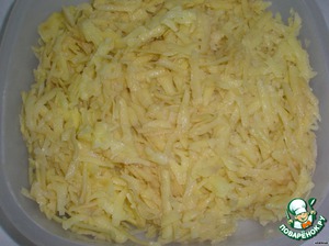 Натереть картофель, отжать жидкость, добавить яйца, перемешать.
