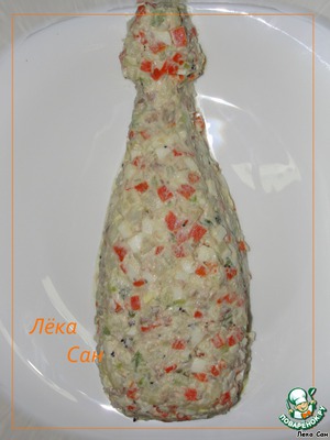 Выложить в форме бутылки на блюдо, прижимая ложкой для плотности салата.