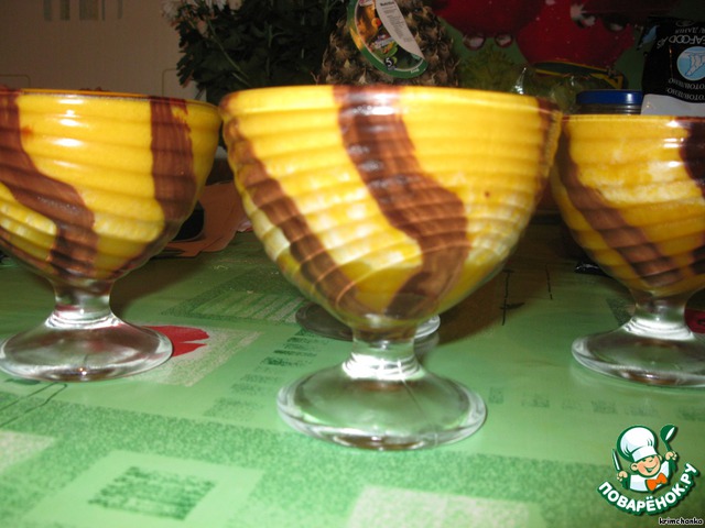 • Разлить в креманки и охладить. На креманки я изнутри нанесла шоколадные полосы и сверху добавила цвета хозяина года. Подавать с сиропом, шоколадом. Приятного аппетита!