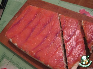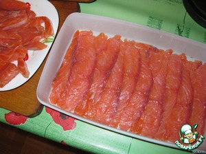 Прямоугольную форму застелить пищевой пленкой. На нее выложить ломтики рыбы так, чтобы полностью покрывали дно. -