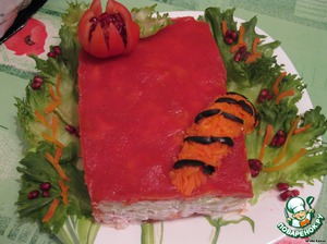 После этого проливаем верхнюю "обложку" помидорно-желатиновой смесью в несколько приемов, держать в холодильнике. Когда застынет - сделать хвостик из моркови и маслин. "Я здесь" - показывает нам тигр. Украсить по желанию.