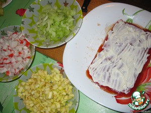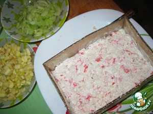 Так же выложить сельдерей и яблоко с майонезом. Поставить опять в холодильник. Сильно оно не застывает - только немного схватится для формы.