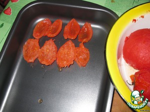 Помидоры бланшировать, снять кожицу. Надрезать помидор накрест, снять лепестки, выложить на противень, посолить, поперчить и поставить в духовку, разогретую до 180 градусов на 15 минут.