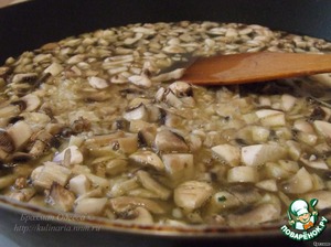 -Добавляем грибы, вино и бульон. Доводим до кипения. Накрываем и готовим минут 10.