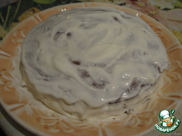 • Делаем глазурь: варим ложку сл. масла, ложку сметаны, ложку какао, 2 ложки сахара, 30 г. шоколада. Украшаем торт глазурью.
