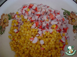 Мелко режем крабовые палочки. Открываем банку кукурузы. -